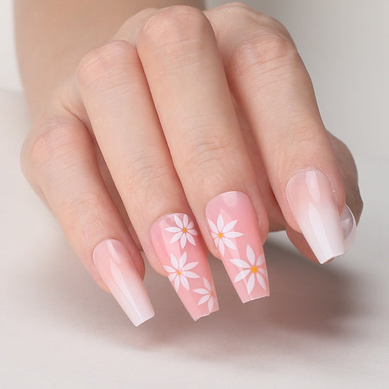 Un subtil mélange de rose clair et de magnifiques motifs blancs, voilà ce que nous proposent ces faux ongles rose clair. La forme ballerine de ces faux ongles confère de l'élégance et du charme à votre look. Les motifs blancs qui s'y trouvent permettent d'ajouter une petite touche glamour.